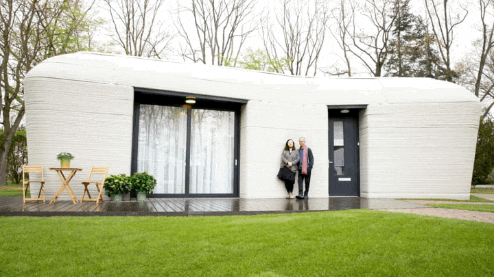 Snapshot answer It's the first inhabited fully 3D-printed home in the world. Two retired shopkeepers from Amsterdam, Elize Lutz and Harrie Dekkers, moved into the 1,010 sq ft house this week. It consists of 24 concrete blocks, which were printed by a large robotic arm then fitted together, and took just 120 hours to create. "It has the feel of a bunker – it feels safe," says Dekkers. Watch how the house was made here.