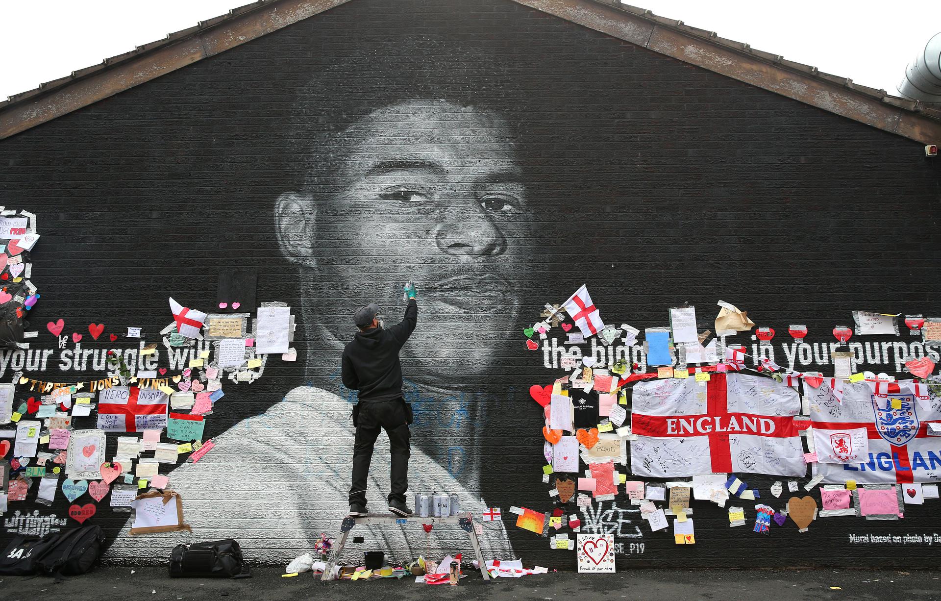 Thoughts on England's defeat by Marcus Rashford A defaced mural of Marcus Rashford being repaired yesterday. Alex Livesey/ Danehouse via Getty Images "I don't even know where to start and I don't even know how to put into words how I'm feeling at this exact time. I've had a difficult season, I think that's been clear for everyone to see and I probably went into that final with a lack of confidence … I felt as though I had let my teammates down. I felt as if I'd let everyone down. A penalty was all I'd been asked to contribute for the team. I can score penalties in my sleep so why not that one? It's been playing in my head over and over since I struck the ball and there's probably not a word to quite describe how it feels. Final. 55 years. 1 penalty. History. All I can say is sorry. ... I've grown into a sport where I expect to read things written about myself. Whether it be the colour of my skin, where I grew up, or, most recently, how I decide to spend my time off the pitch. I can take critique of my performance all day long, my penalty was not good enough, it should have gone in but I will never apologise for who I am and where I came from. I've felt no prouder moment than wearing those three lions on my chest and seeing my family cheer me on in a crowd of 10s of thousands. I dreamt of days like this … The communities that always wrapped their arms around me continue to hold me up. I'm Marcus Rashford, 23 year old, black man from Withington and Wythenshawe, South Manchester. If I have nothing else I have that." This is an abridged version of Marcus Rashford's statement, posted yesterday on social media