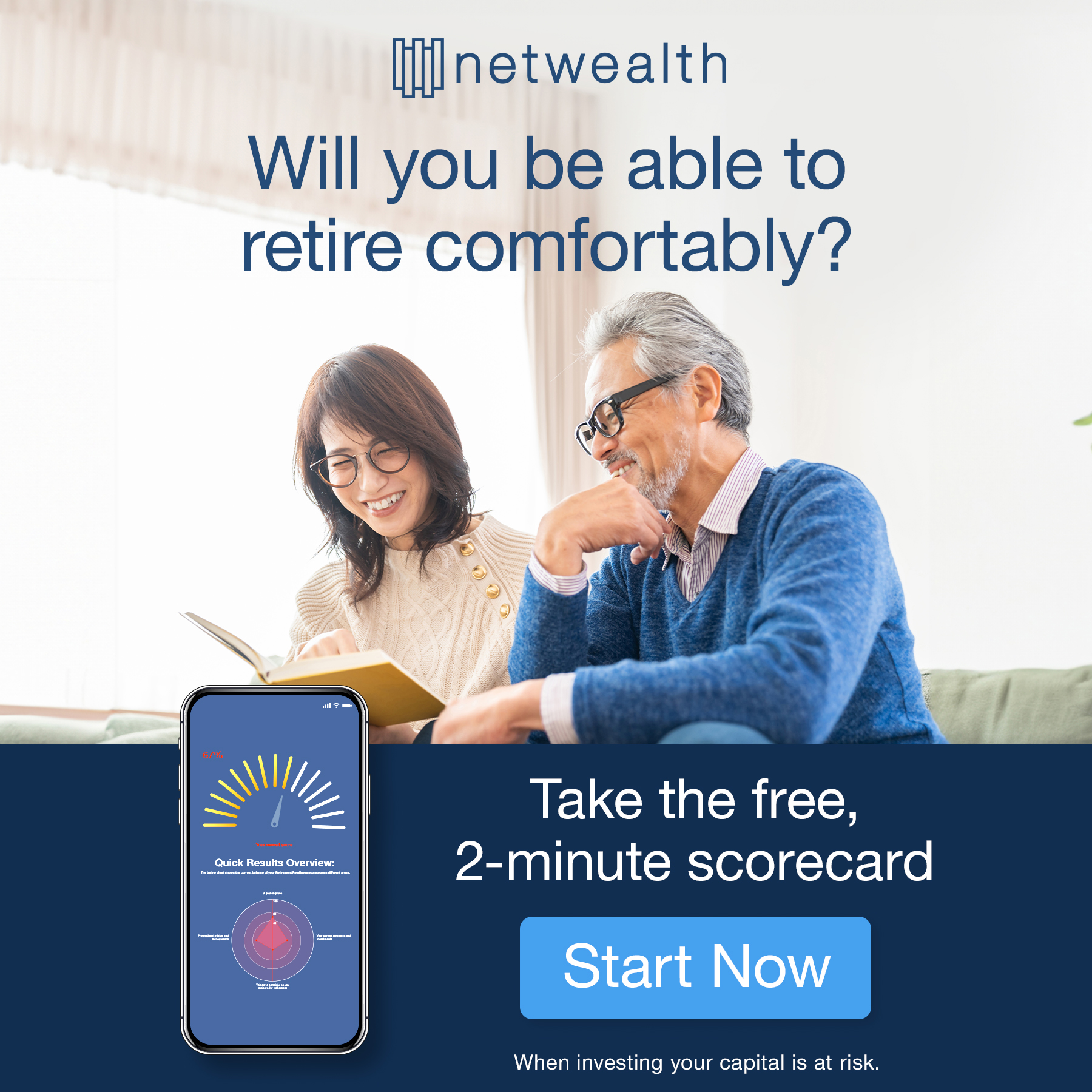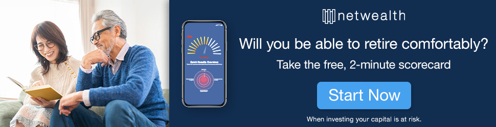 Are you retirement ready? Receive a customised report in just two minutes with the free retirement readiness scorecard from Netwealth. It will help you understand the key areas to consider as you prepare to stop working – with actionable steps to give you a better outcome. And this isn't just for those who are about to retire. Whatever stage you're at, the retirement readiness scorecard can give you a good idea about whether you're on track to achieve your goals – allowing you to change course or make subtle adjustments to maximise your future potential.